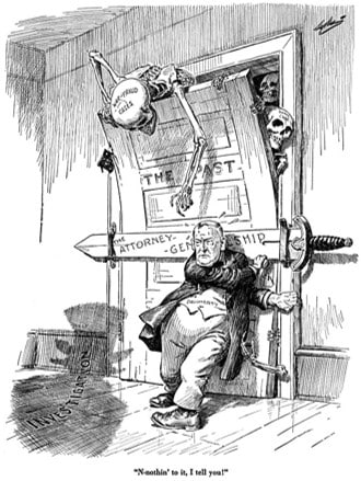 Cartoon depicting the scandals of Harry M. Daugherty, published November 16, 1922 (Source: Life vol. 80, by Charles H. Sykes)